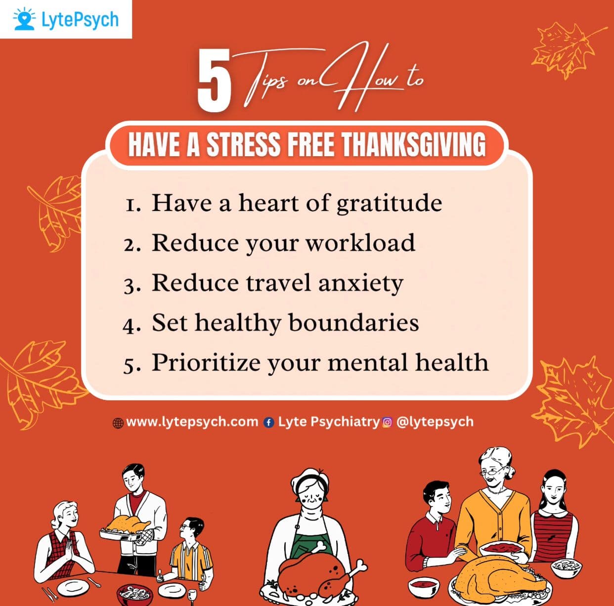 Are you concerned about the impact the holiday season might have on your mental health? A recent study has shown that several adults consider the holiday season as the most stressful time of the year starting from November till New Year’s Day. Stress cannot be avoided during the holidays however, stress can be managed. Here are 5 tips that can help you reduce stress during the thanksgiving holiday: